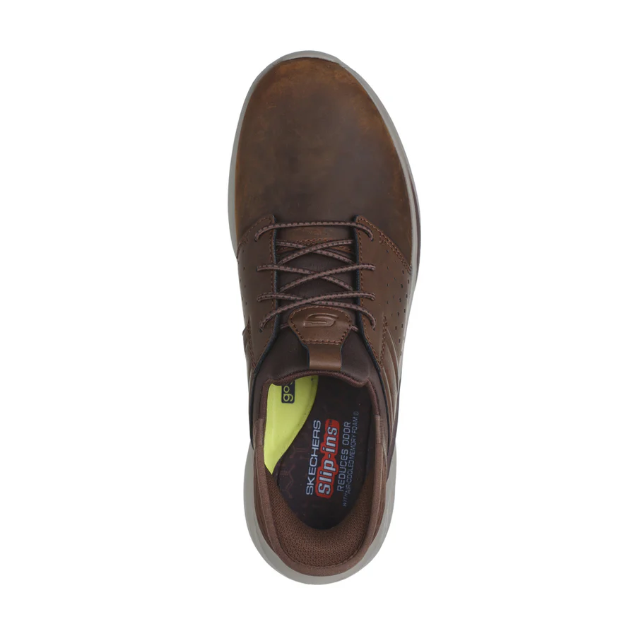 Sleek athletic style arrives with signature comfort in Skechers Slip-ins® Relaxed Fit®: Slade – Zachary. Designed with our Exclusive Heel Pillowâ„¢, this stretch-laced style features a leather and synthetic upper with a charcoal-infused Skechers Air-Cooled Memory Foam® insole and Skechers Goga Mat Archâ„¢ cushioning.