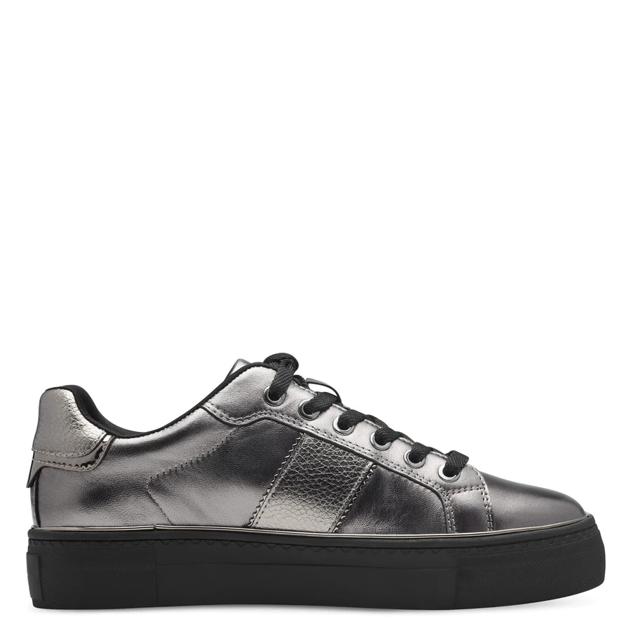 Introducing the Tamaris 23724 Trainers in pewter metallic, fit for the modern woman. This comfortable sneaker boasts a 2.5 cm platform and 6.5 cm shaft for easy wear. The luxurious leather and synthetic materials provide a stylish look, while the round toe and lacing ensures maximum comfort. Complete with COMFORT-Lining and Removable Sock-Technology for a truly indulgent experience. Elevate your style with Tamaris.
